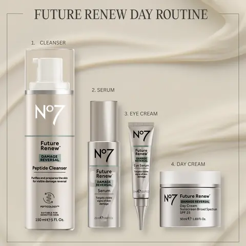No7 Future Renew Day Cream SPF25 is proven to to protect against UV and reverse visible signs of skin damage, such as the feeling of dryness and loss of elasticity. Powered by Pepticology™, this techonology supports the skin's natural self-repair process.