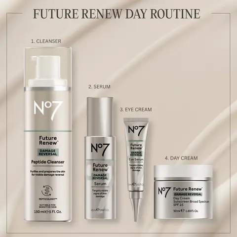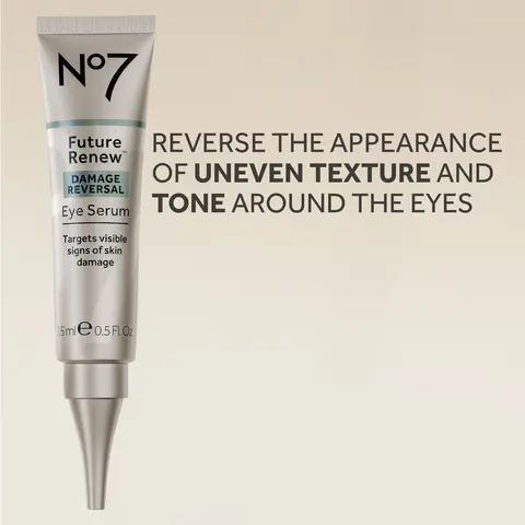 The No7 Future Renew Damage Reversal Eye Serum reverses visible signs of skin damage around the eyes, such as the appearance of fine lines and wrinkles, uneven tone and texture, and the feeling of lost elasticity**.