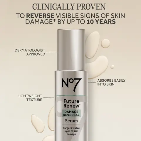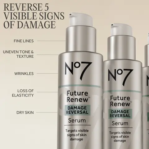 The No7 Future Renew Damage Reversal Serum reverses visible signs of skin damage in 4 weeks*. Formulated with Pepticology, this face serum reverses the appearance of fine lines and wrinkles while improving dryness**.