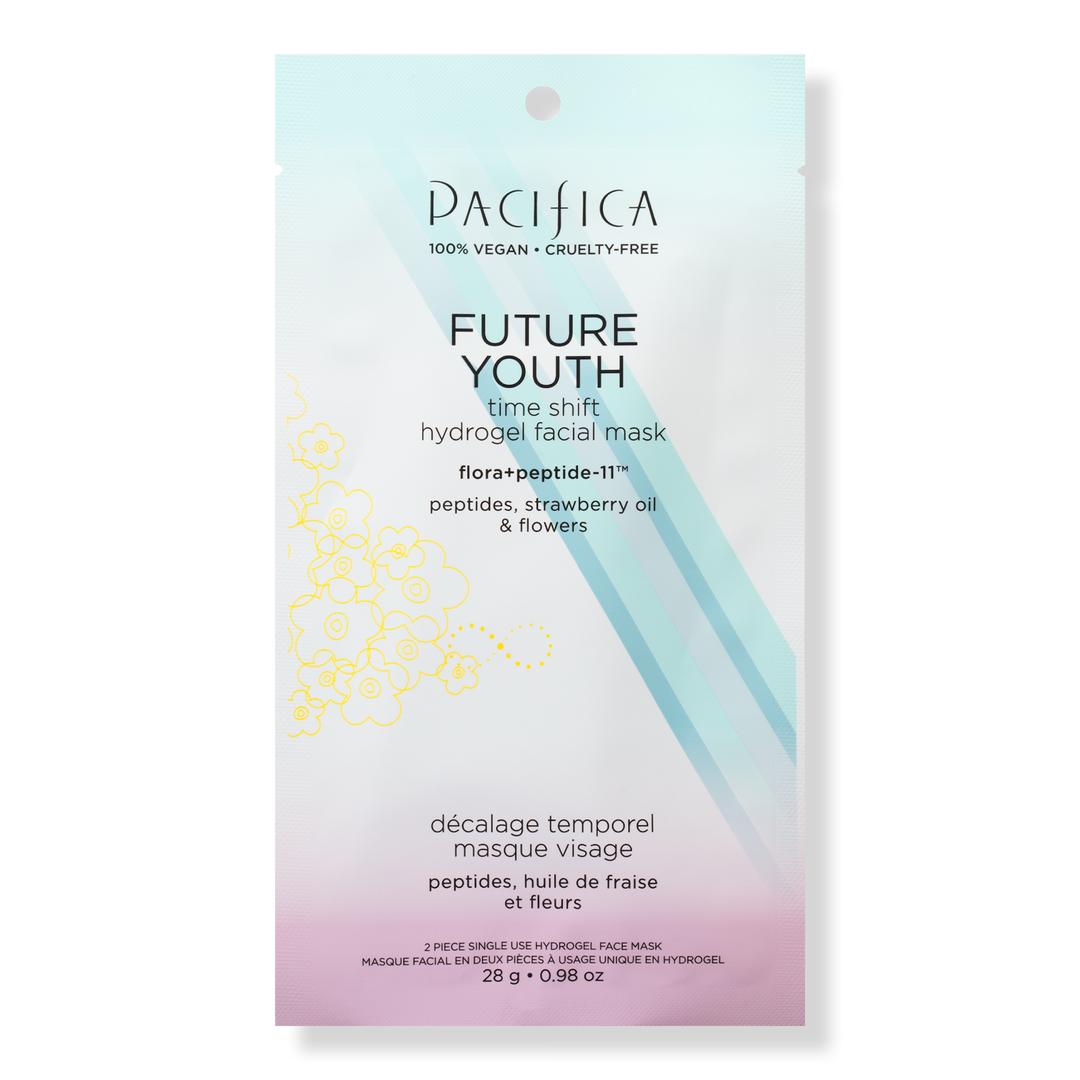 Beauty's Future Youth Time Shift Hydrogel Facial Mask is an ultra-hydrating serum-soaked hydrogel mask containing Pacifica's exclusive Flora+peptide-11 complex of multi-peptides and phytonutrients to help address signs of aging and provide a lipo-plumping effect to your face, décolletage, and neck.