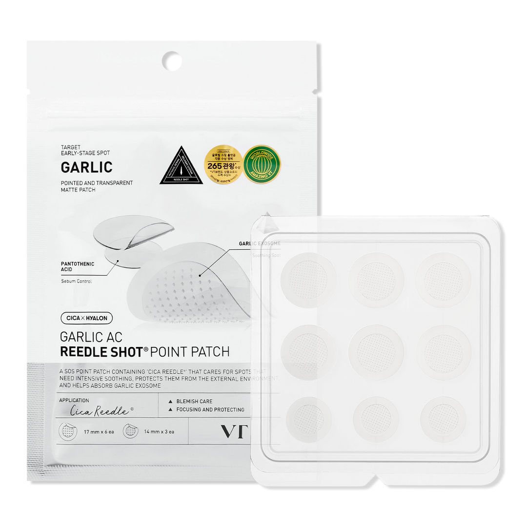 VT Cosmetics Garlic AC Reedle Shot Point Patch is an SOS patch with VT’s exclusive CICA REEDLE, designed to soothe spots in need of intensive care, protect them from external irritants, and enhance the absorption of GARLIC EXOSOME.