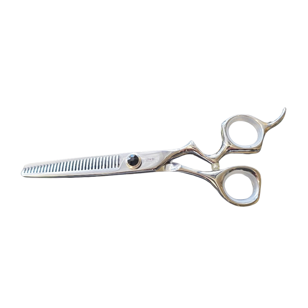 The Bonika Gazelle Drop-Finger Thinning Shear delivers graceful control with smooth blending performance. Made from high-carbon 440C forged steel with a true convex edge, this 30-tooth thinner features an ergonomic drop-finger handle that supports fluid cutting motion and comfortable control.