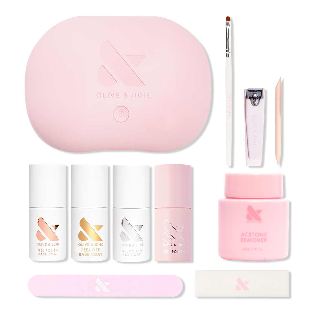Everything you need for a salon-quality gel mani at home. Includes full size products. Olive & June Gel HEMA-free, 15-free, long-lasting gel polish for up to 21 days of salon-quality results at home. Removes without damage.