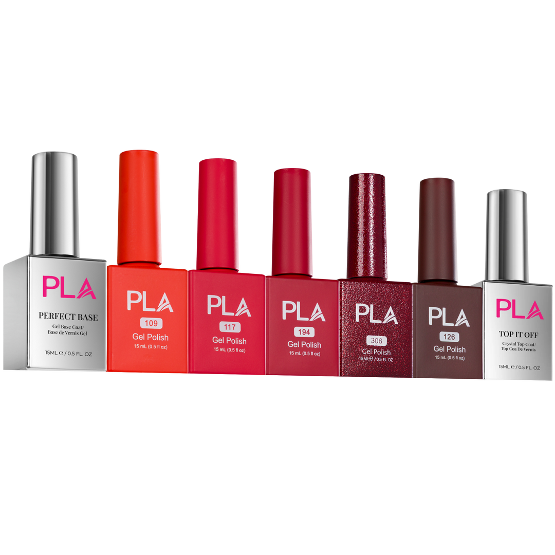 Achieve long-lasting gel manicures at home with the PLA Gel Polish Starter Kit. This set includes PLA Perfect Base, PLA Top It Off, and 5 gel polishes in a variety of shades. Designed for LED curing, it pairs perfectly with the PLA UV lamp for durable, high-shine results.