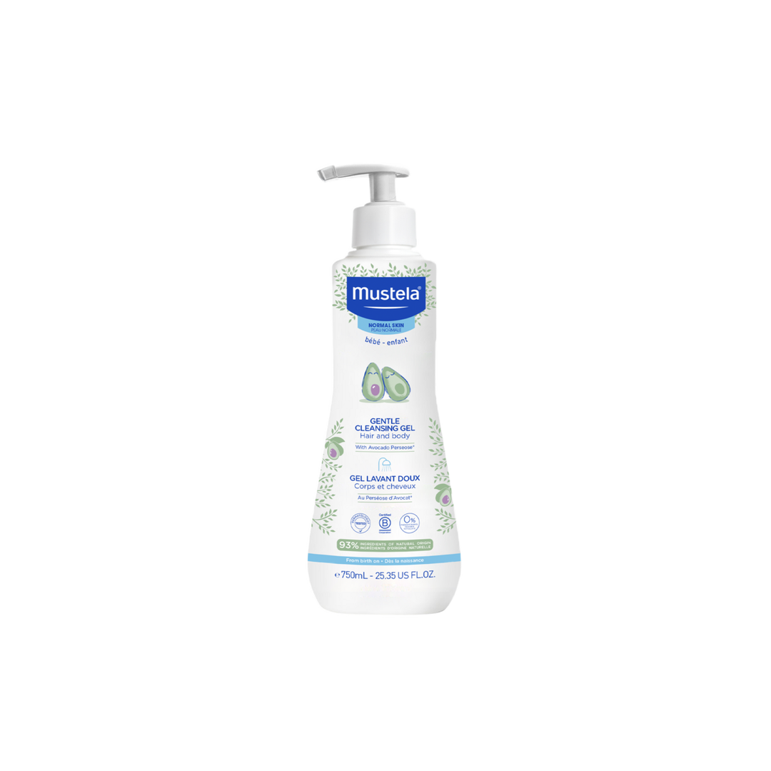 Tear-free baby cleansing gel with 93% natural ingredients, including Avocado Perseose® and Vitamin B5, gently cleans and nourishes skin and hair while leaving a light, fresh scent.