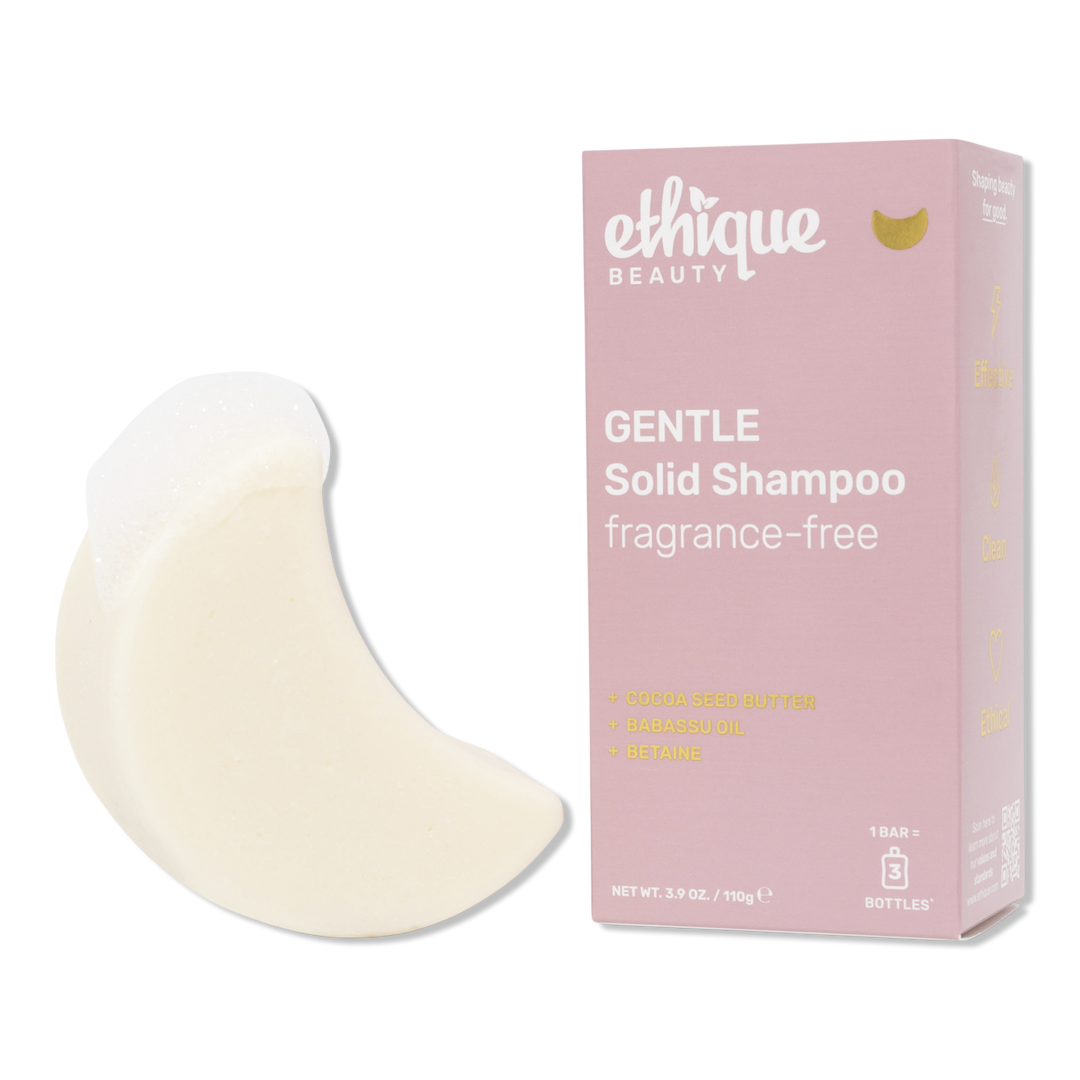 Ethique Beauty's Gentle Shampoo is a mild, fragrance-free shampoo that cleanses and nourishes scalp and hair. Babassu oil, betaine, and cocoa butter leave hair soft and manageable. No fragrances or essential oils.