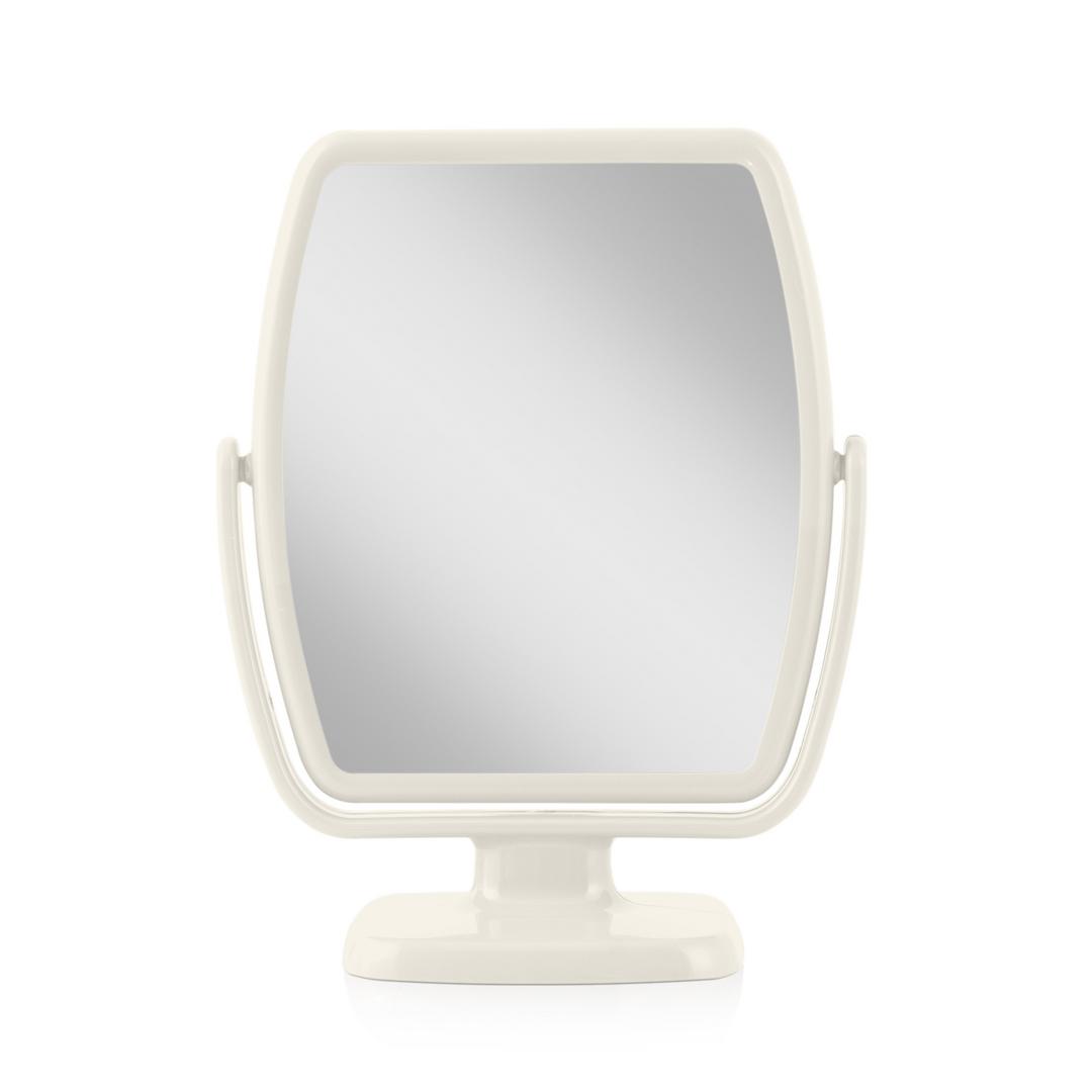 8.9-inch by 7-inch. Geometric Design Makeup Mirror with 5X/1X Dual Magnification. 360-Degree Endless Mirror Head Rotation. Optical Quality Glass. Glossy Acrylic Finish.