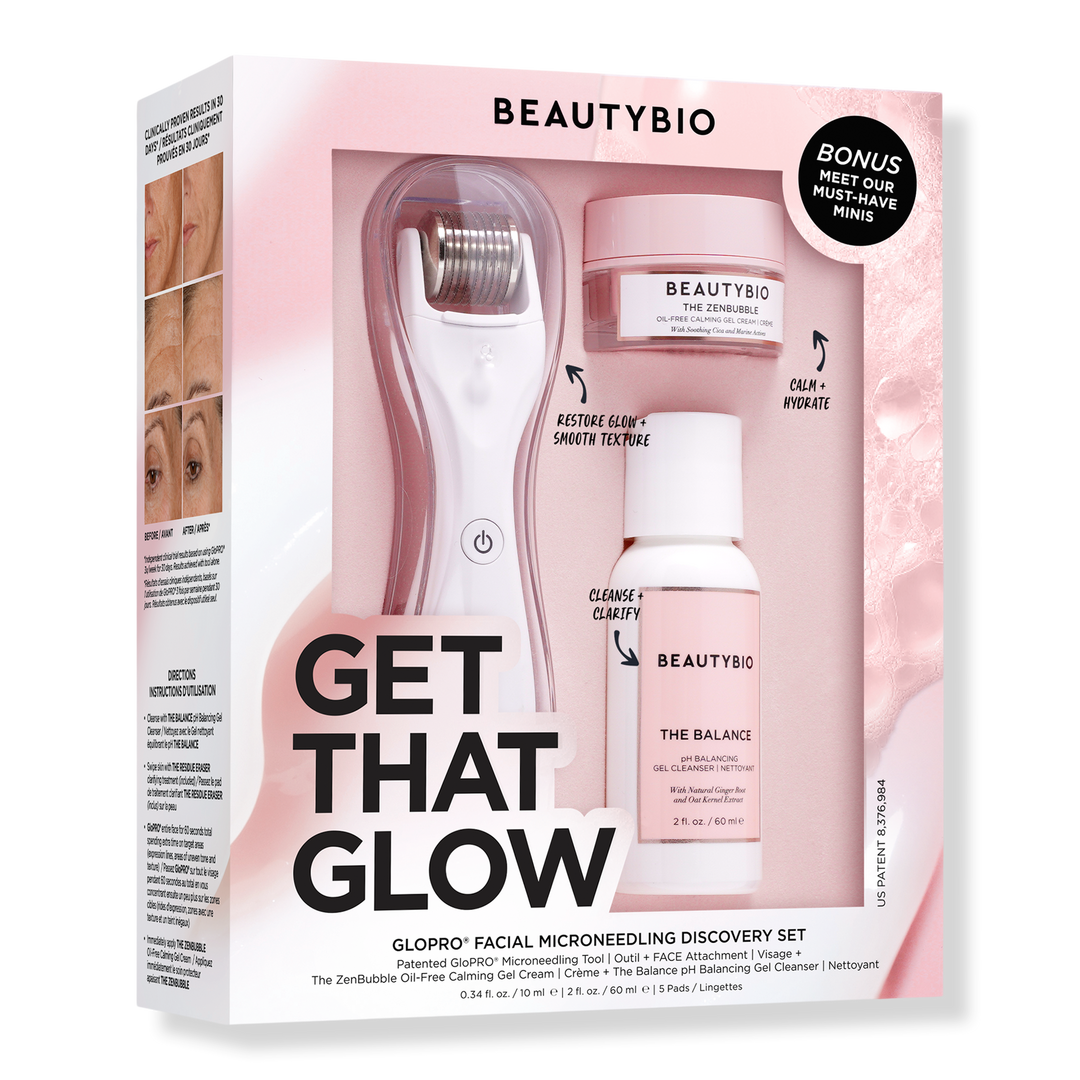 BeautyBio's Get That Glow GloPRO Facial Microneedling Discovery Set is a patented, award-winning microneedling tool that amplifies skincare absorption and creates firmer, smoother skin in just 60 seconds a day.