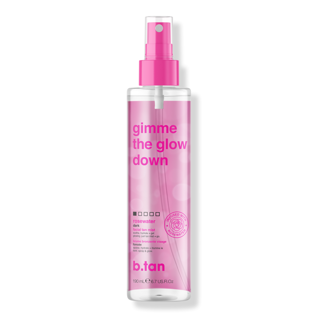 Use b. tan Gimme The Glow Down Facial Tan Mist to soothe, hydrate + get glowing... just tan, mist + go with this soothing, rosewater infused facial tan mist for face + body.