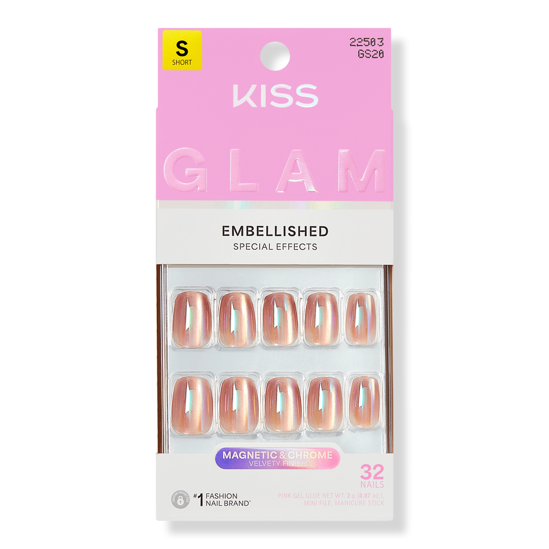 NEW Look. MORE Nails. BETTER Fit. KISS GLAM 3D Press On Nails feature chrome, iridescent, magnetic, and jewel finishes come together for a high-style look that shines from every angle—no salon needed.