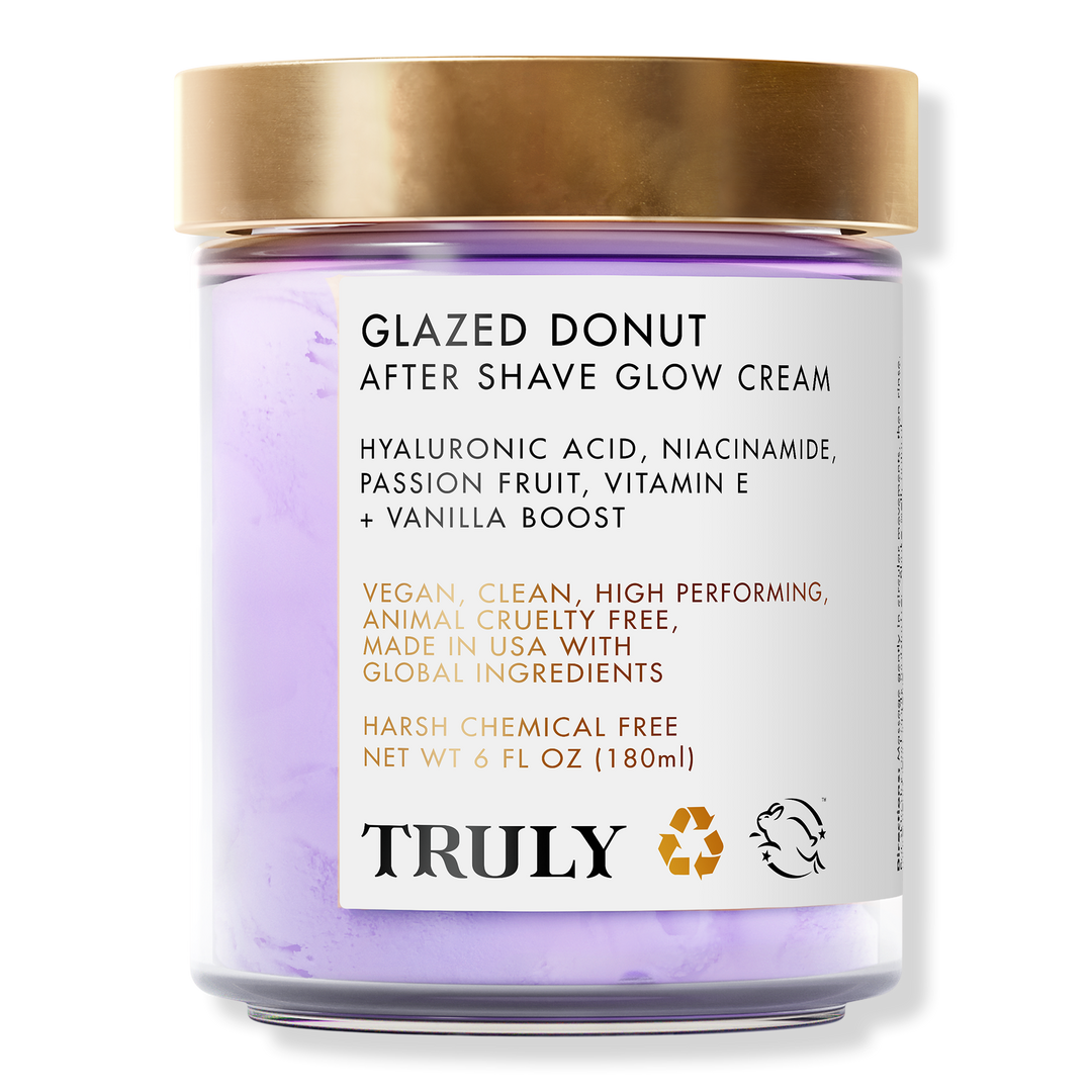 A rich body butter that hydrates, softens, and soothes with hyaluronic acid, niacinamide, and vitamin E. Truly's Glazed Donut After Shave Glow Cream protects your freshly shaved skin all day long while quelling razor burn and ingrowns. Use it everywhere for day-long luminosity.