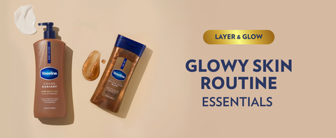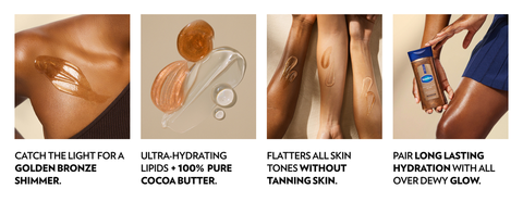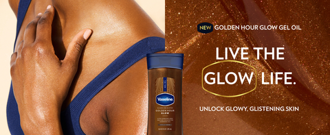 Vaseline Glazed and Glisten Body Gel Oil is a luxurious, silky formula that melts into the skin, leaving a light-catching, golden bronze shimmer for a warm, sun-kissed glow without tanning the skin.