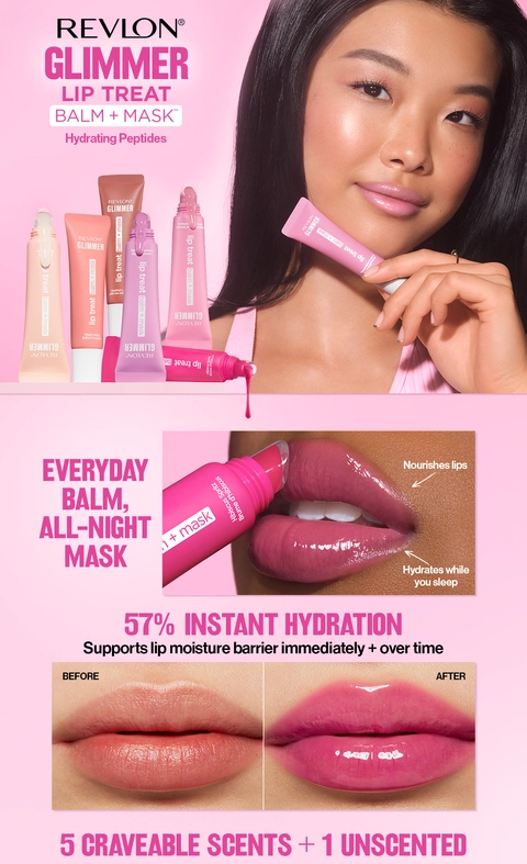 Hydrating Peptides. 57% instant moisture boost. Revlon Glimmer Lip Treat Balm + Mask doubles as an everyday lip balm + all-night lip mask.