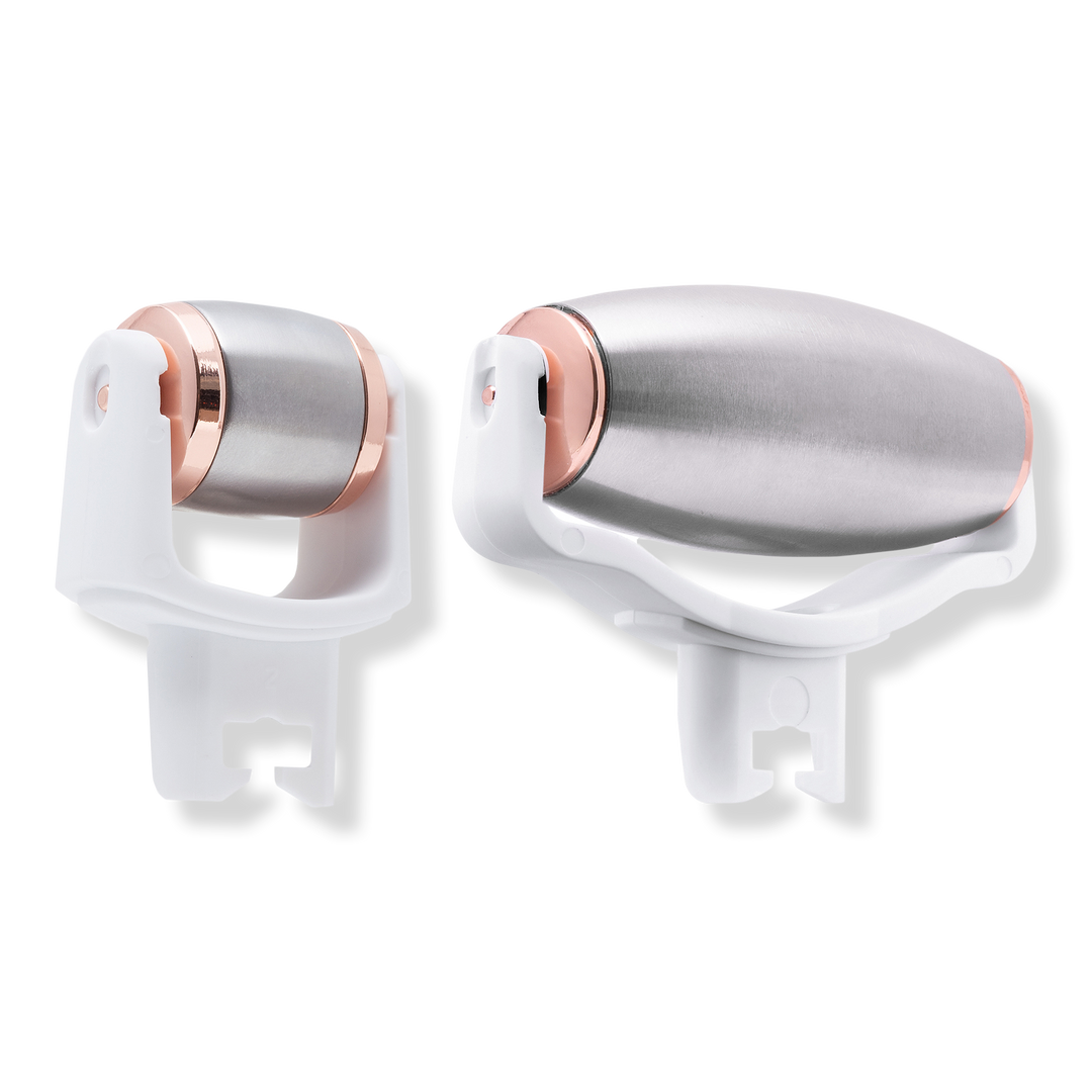 The BeautyBio GloPRO CRYO Roller Attachment Duo instantly tightens pores, reduces visible redness, de-puffs, and creates a more sculpted appearance.