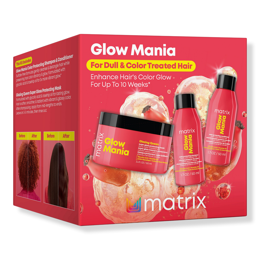 Preserve color vibrancy and enhance shine with the Matrix Glow Mania Mini Kit! Includes shampoo, conditioner, and mask formulated with glycolic acid and rosehip oil. Protects and softens dull, color-treated hair for a luminous, 10-week glow.