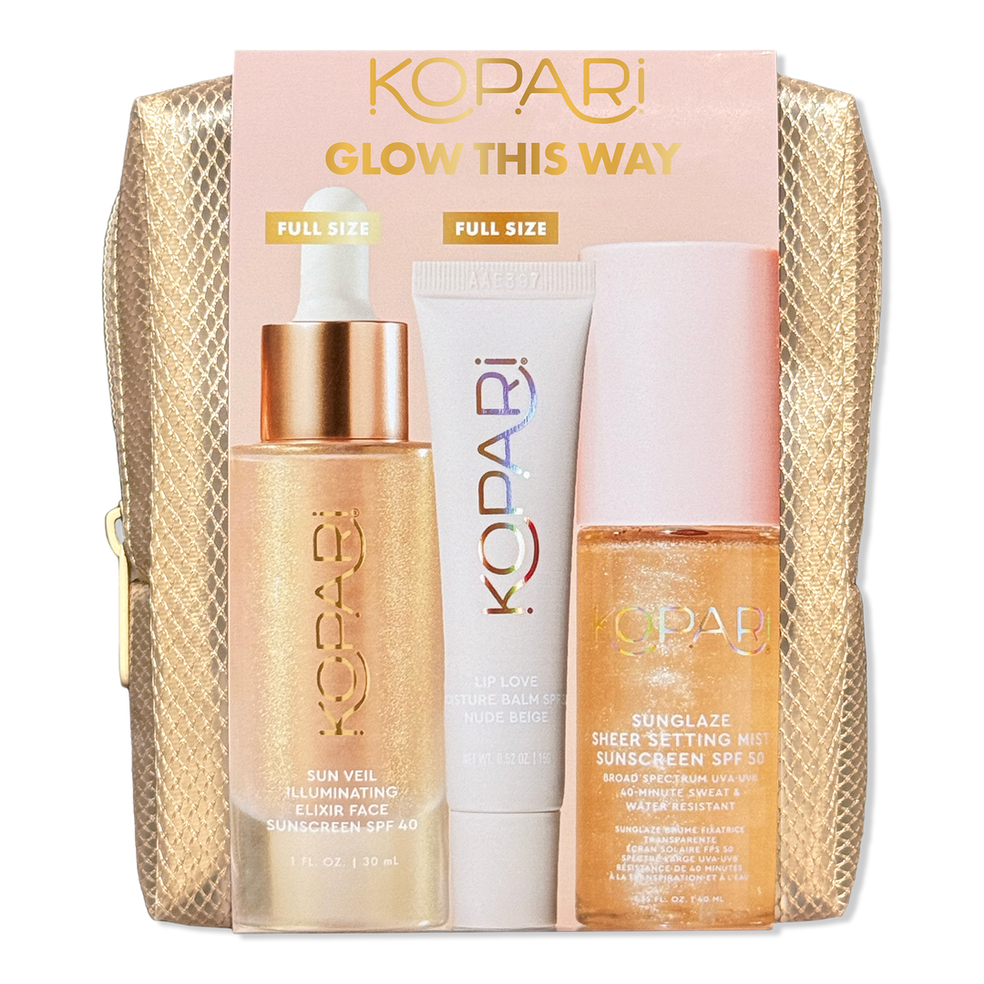 Kopari’s Glow This Way SPF Kit delivers radiant face protection in one easy routine. Create a luminous base with Sun Veil Illuminating Elixir Face Sunscreen SPF 40, nourish lips with Lip Love Moisture Balm SPF 30 Nude Beige, and achieve effortless glass-skin with Sunglaze Sheer Setting Mist SPF 50.