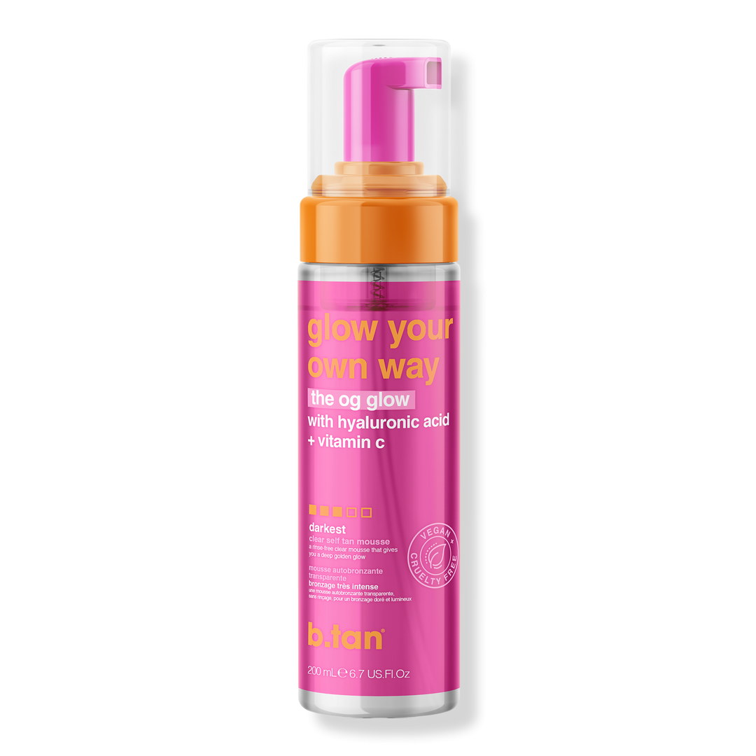 Tan time is any time with b.tan's clear Glow Your Own Way OG Mousse! Just apply and go for that effortless glow, no rinse required. Enriched with Hyaluronic Acid and Vitamin C for an ultra juicy finish.