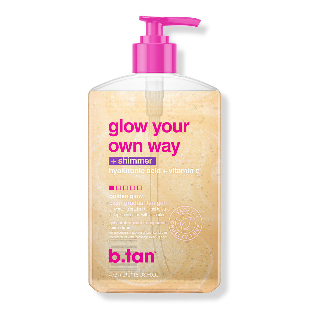 b.tan Glow Your Own Way + Shimmer Shimmering Clear Self Tan Gel - All that shimmers might be gold! A self tan gel with gold shimmer to sparkle like the bright diamond you are, all while tanning yourself to golden perfection.