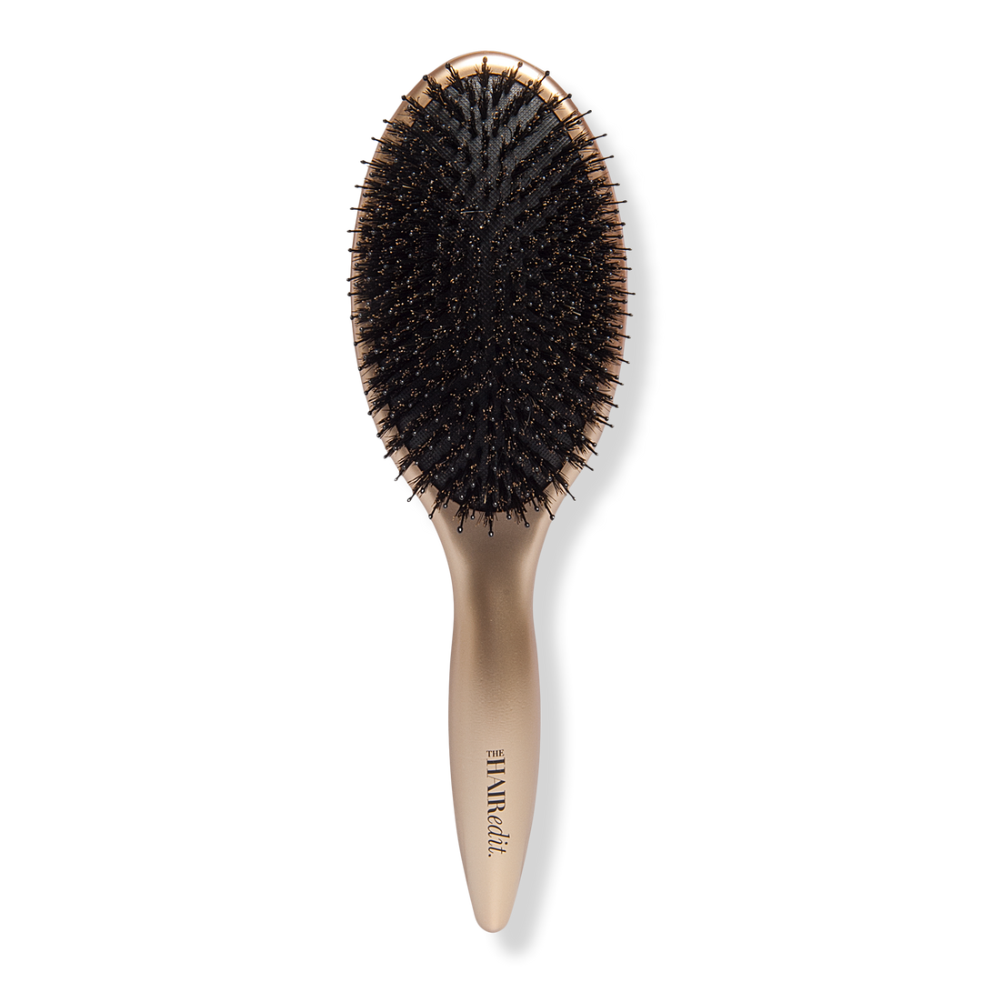 The Hair Edit's high-quality Gold Finish & Shine Boar Bristle Brush boosts the health & shine of your hair while smoothing, detangling, and taming flyaways.