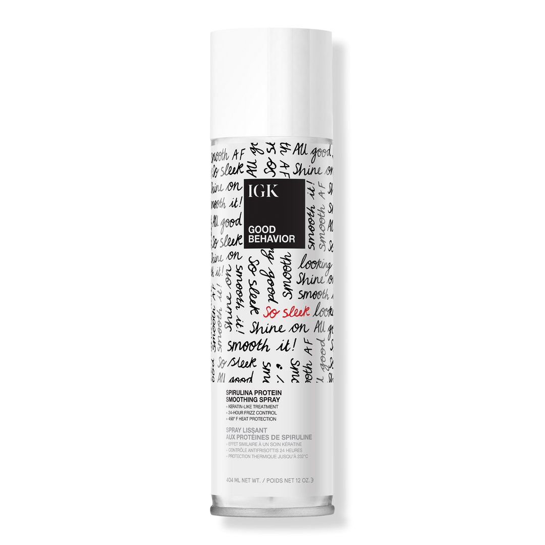 IGK’s Good Behavior Spirulina Protein Spray is a heat-activated smoothing blowout spray that mimics the frizz-free, high-shine results of a keratin treatment. Provides a sleek, glass hair finish and protects against humidity and UV damage with 24-hour frizz control and 450°F heat protection.