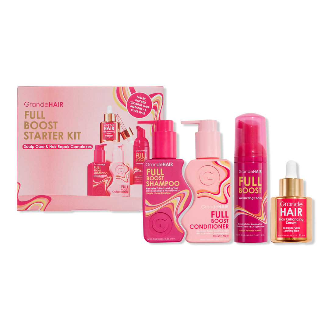 GrandeHAIR Full Boost Starter Kit by Grande Cosmetics. Hair science from the lash & brow serum experts - now for fuller, thicker looking hair. These products are designed to help improve visible hair density & fullness and to give fine, thinning, damaged hair a boost, both instantly & over time.