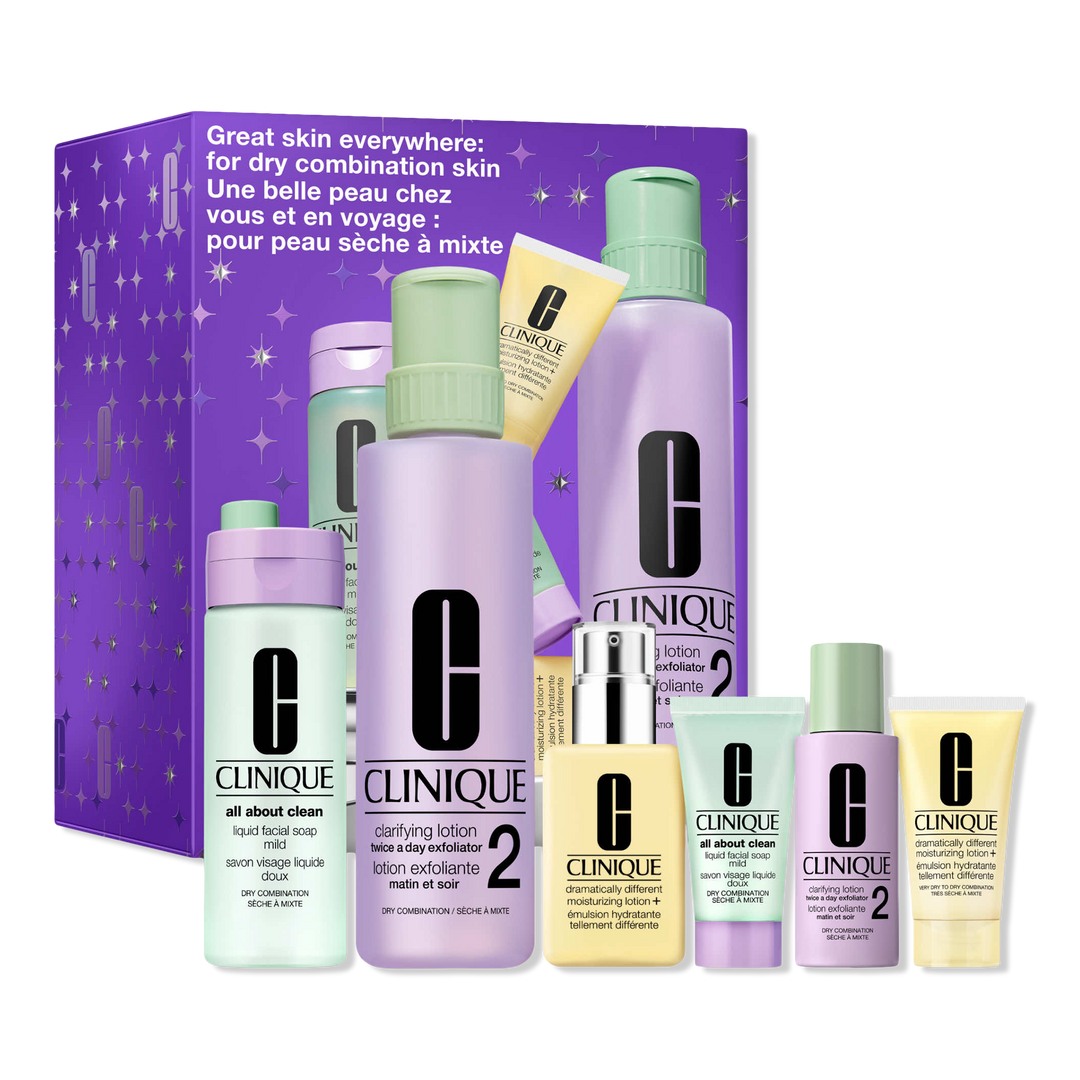Clinique Great Skin Everywhere Set: For Dry Combination Skin is a holiday set featuring Clinique's dermatologist-developed 3-Step system in full + travel sizes.