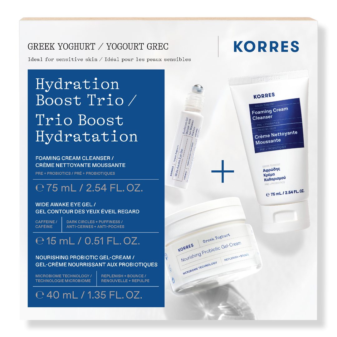 KORRES Greek Yoghurt Hydration Boost Trio unlocks time-released hydration for 48 hours.