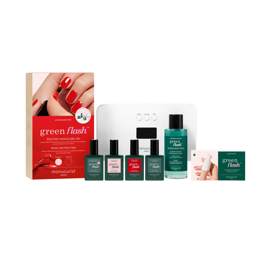- This kit includes: - 1 Vitamin-Enriched Green Flash Base Coat - 2 Green Flash Colors: Hortencia (Sheer Pale Pink) & Poppy Red (Bright Orangy Red) - 1 Green Flash Top Coat - 1 Pro LED Lamp 36W - 1 Gentle Acetone-Free Remover - 5 Removal Clips The Green Flash™ routine requires a base coat, a color, a top coat from the Green Flash range, and our 36W LED lamp