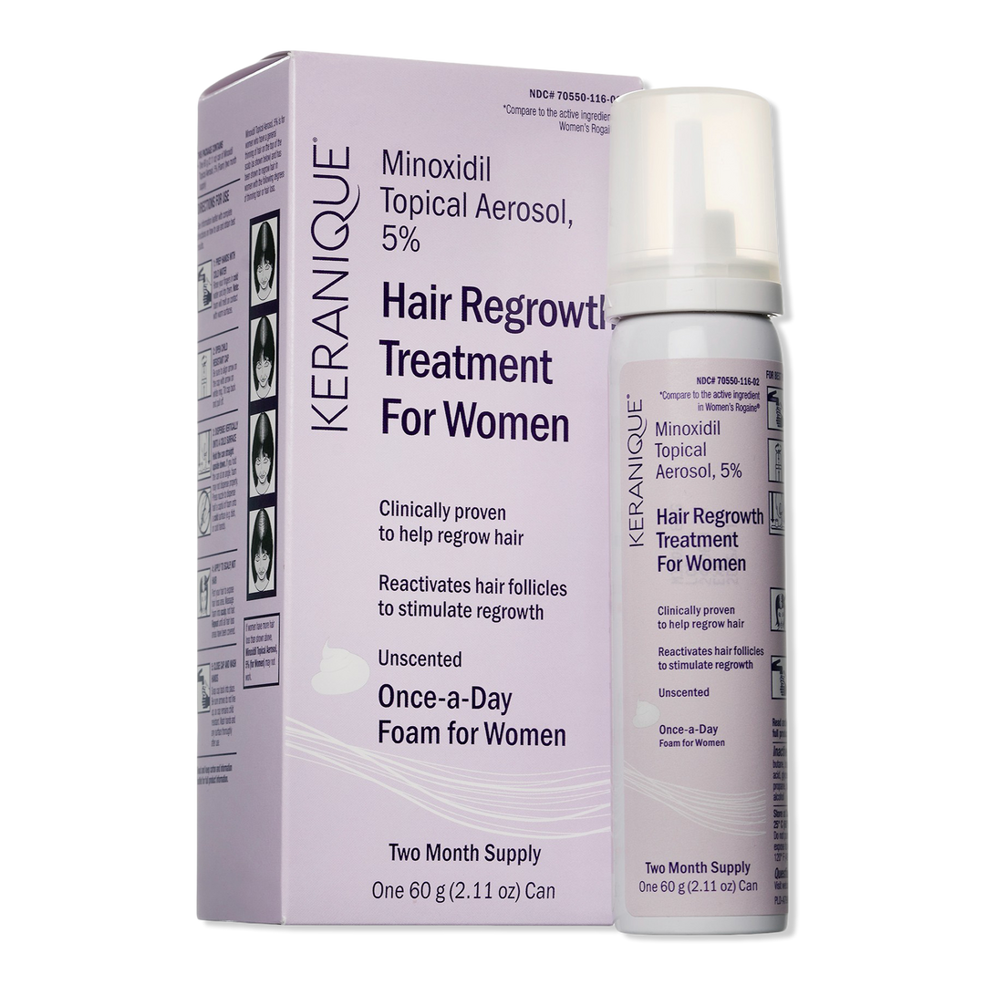 Keranique Minoxidil Topical Aerosol, 5% Hair Regrowth Treatment for Women is a Foam hair treatment featuring the only FDA-approved ingredient clinically proven to help women regrow hair. It is an easy once-a-day foam that works while you sleep to reactivate hair follicles and stimulate growth.