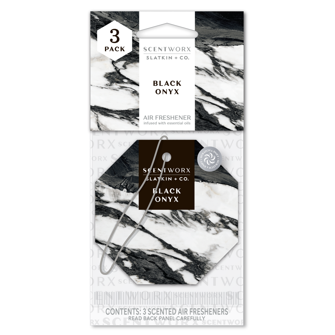 Scentworx Black Onyx Auto Air Freshener Hangers 3 Pack is made with luxury essence of a new car captured with fresh leather and sandalwood.