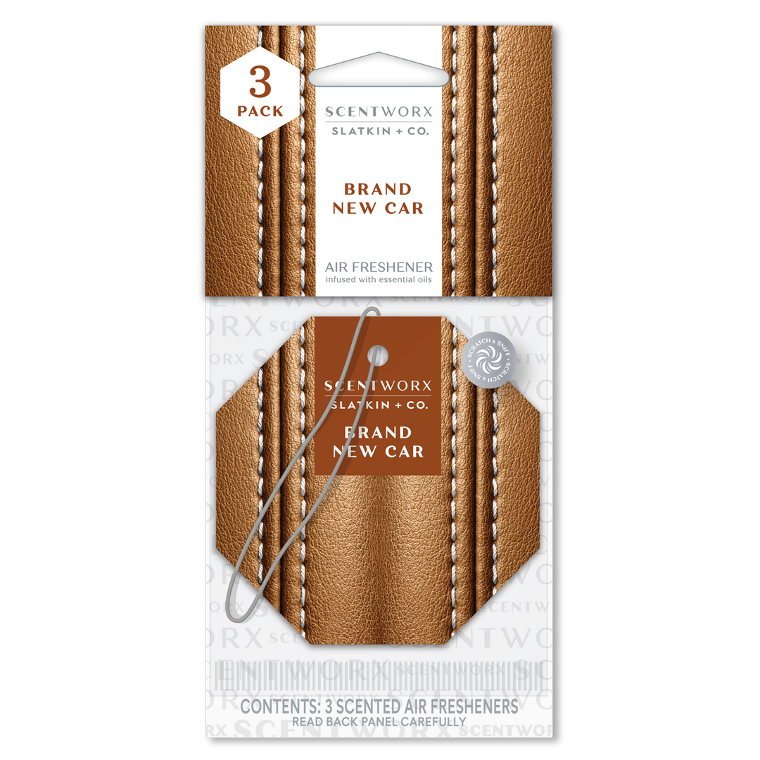 Scentworx Brand New Car Auto Air Freshener Hangers 3 Pack is made with luxury essence of a new car captured with fresh leather, oakmoss, musk, and a touch of vanilla bean.
