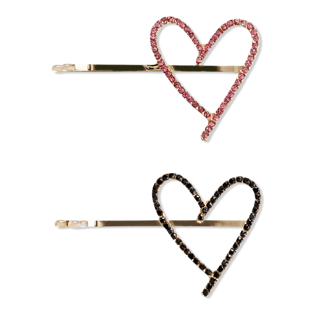 - Set of two bobby pins with heart-shaped rhinestone detail