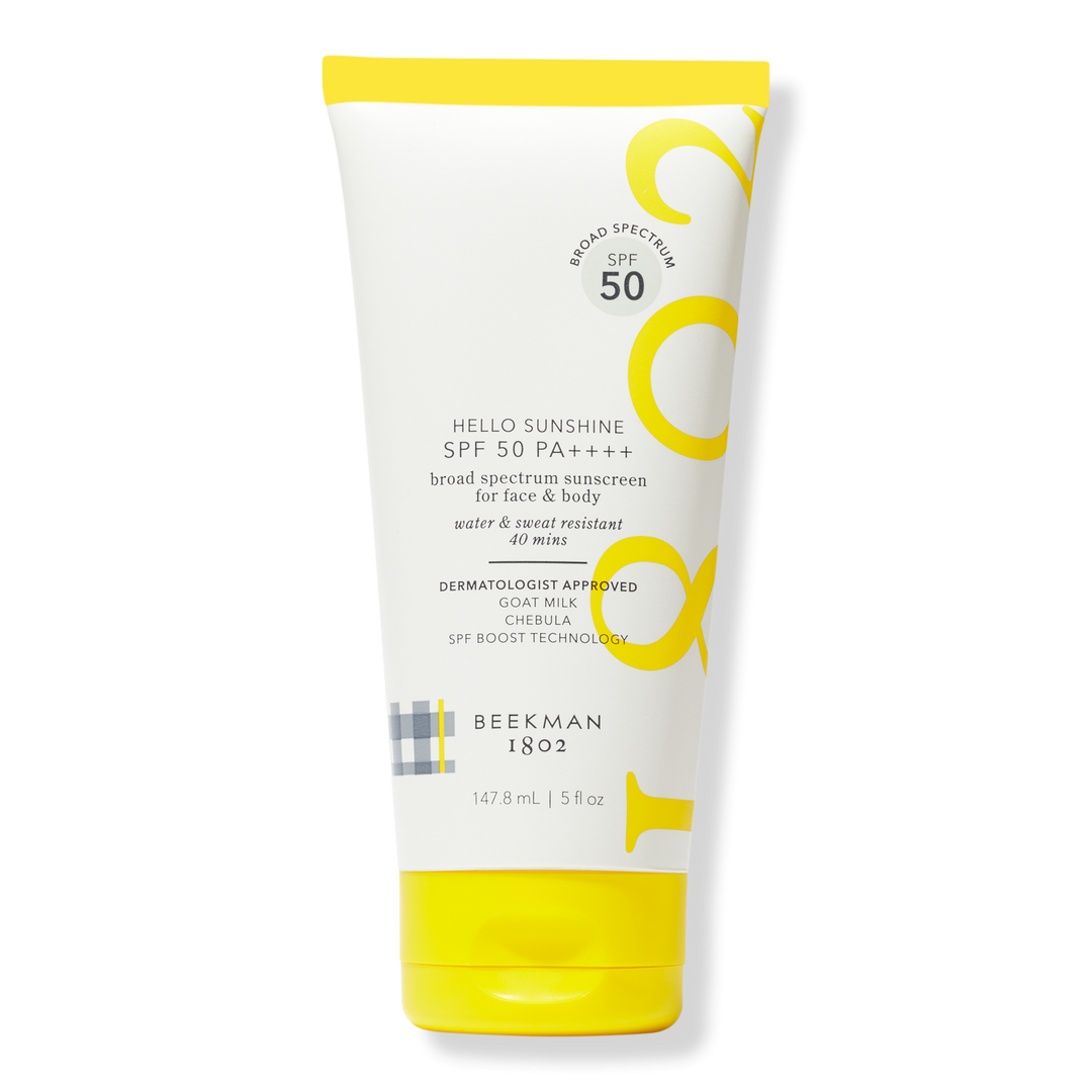 Beekman 1802 Hello Sunshine SPF 50 PA ++++ is a clinically proven sunscreen for face and body with goat milk and chebula fruit to protect against accelerated aging.