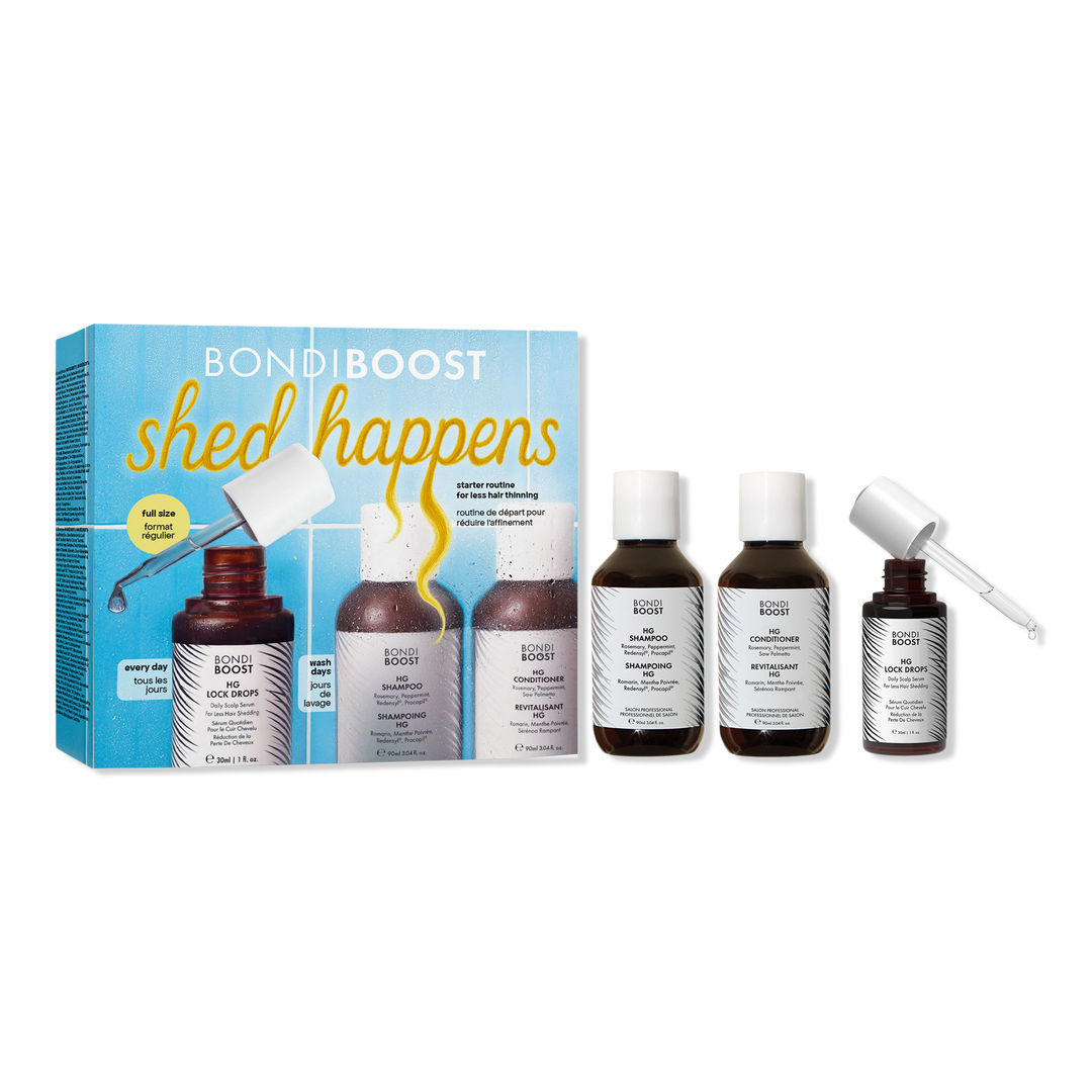 BondiBoost Shed Happens Kit includes mini HG Shampoo + Conditioner and full-size HG Lock Drops to reduce shedding and support fuller, stronger-looking hair.