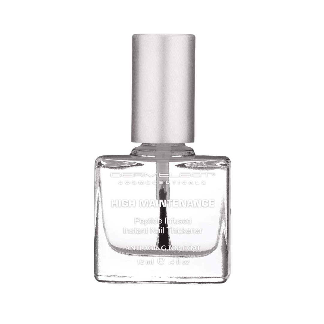 - High on shine and long on durability, Dermelect High Maintenance Instant Nail Thickener utilizes protein-peptide technology to instantly thicken the top of your nails with a durable, manicure extending top coat. Add layers of protection to natural nails or top your polish with a long-lasting high shine and protective reinforcement. With the unique strengthening property of a keratin protein peptide derived from New Zealand sheep's wool, your nails may appear more resistant to splitting, breaking and chipping. Fast drying and super glossy, this innovative, thickening treatment contains a UV absorber to protect your polish from yellowing while preventing both light and dark colors from quickly fading. Hands down, one of the most innovative top coats you will ever use! Perfect for all nail types: Hard to Grow, Brittle, Thin, Chipping, Weak, Brittle, Splitting, Acrylic / Gel Damaged.