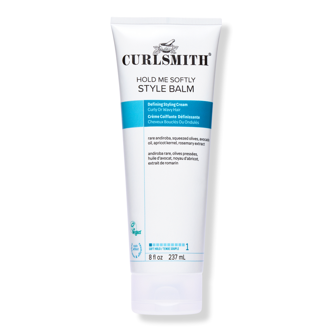 Curlsmith Hold Me Softly Style Balm is a soft-hold curl-enhancing styling cream that provides loose, soft definition without crunch.