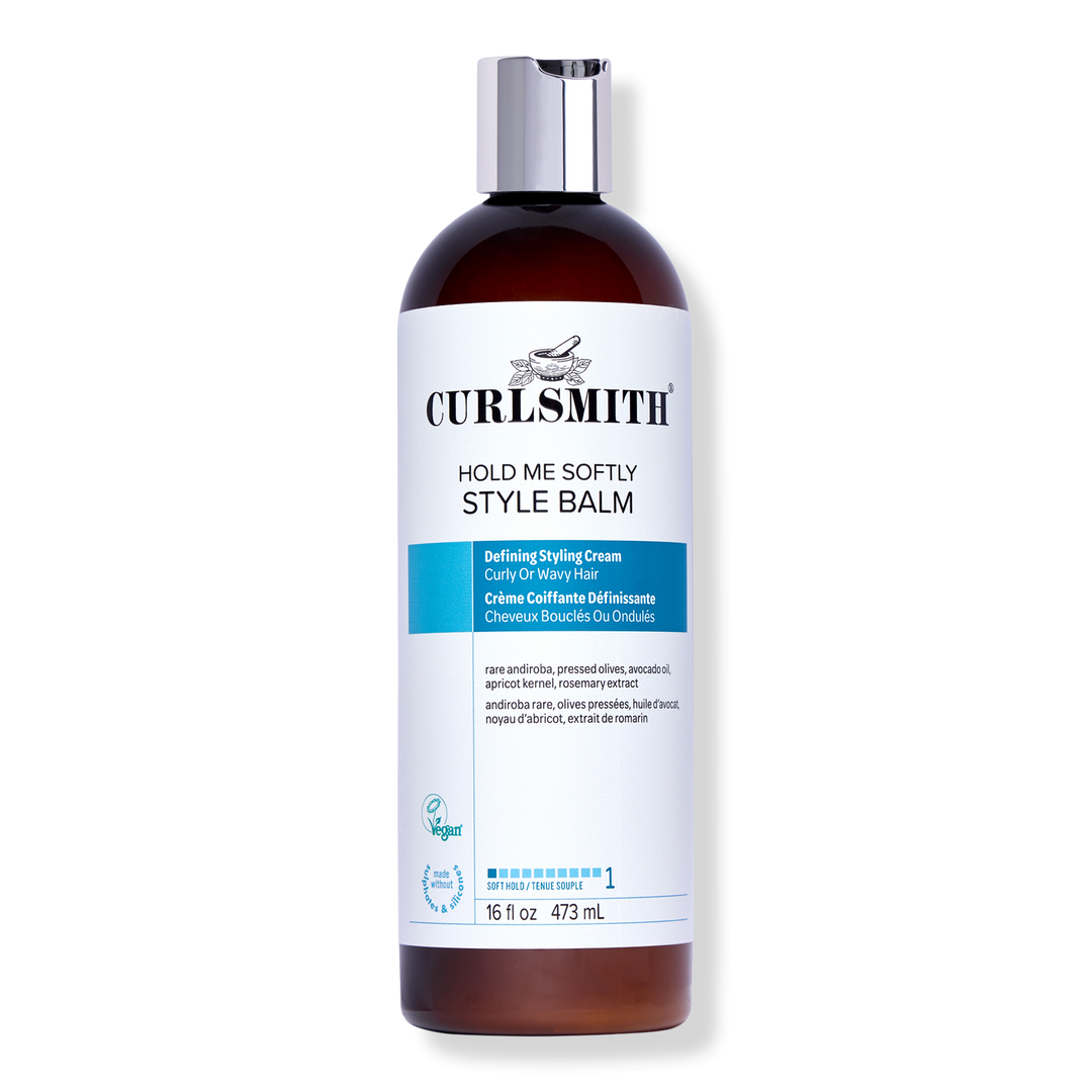 Curlsmith Hold Me Softly Style Balm is a soft-hold curl-enhancing styling cream that provides loose, soft definition without crunch.