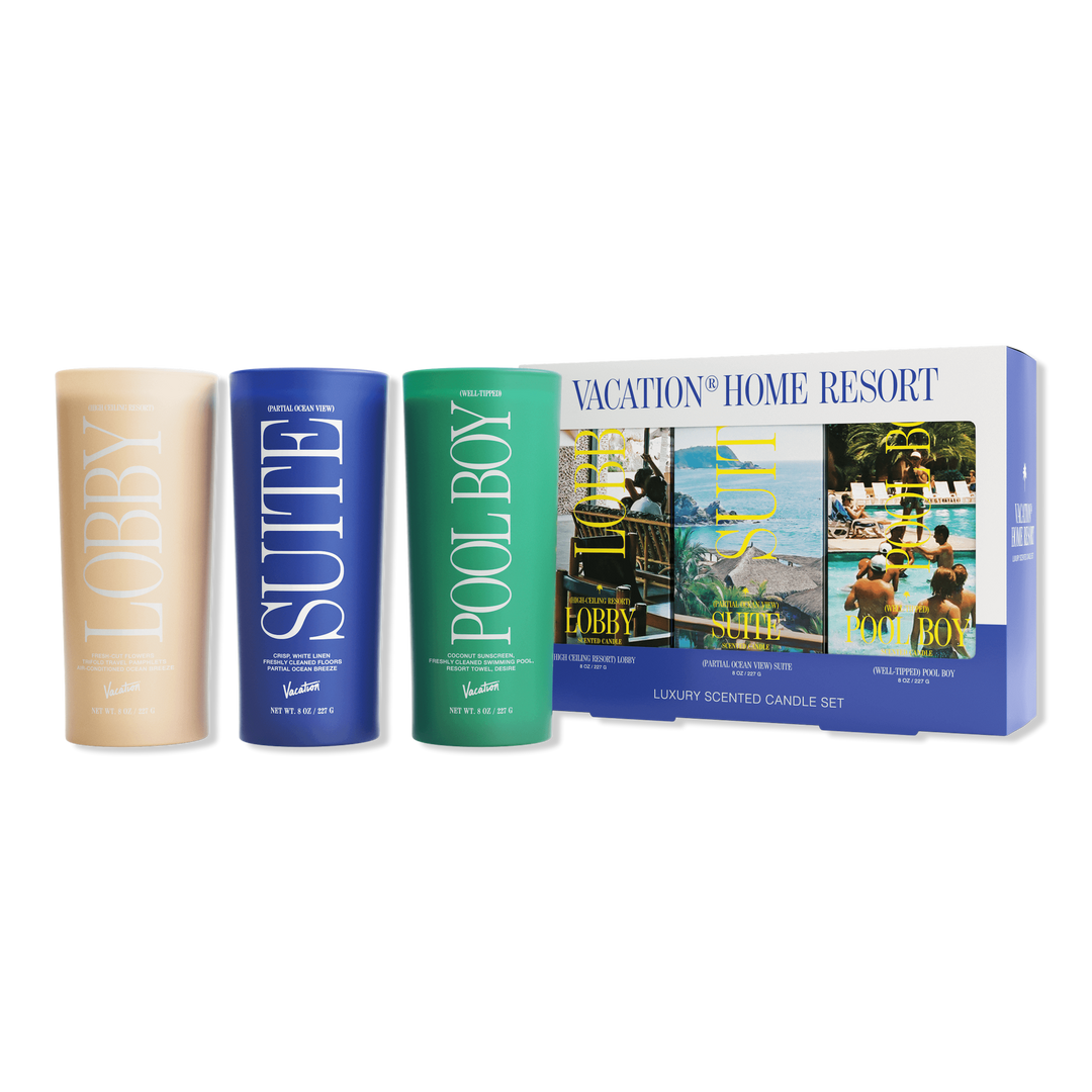 Three luxury scented candles in this Vacation Home Resort Three Candle Set made in conjunction with ARQUISTE Parfumeur designed to turn your home into a 7-Star luxury resort. Featuring "High Ceiling Resort Lobby", "Partial Ocean View Suite" and the world-famous "Well-Tipped Pool Boy".