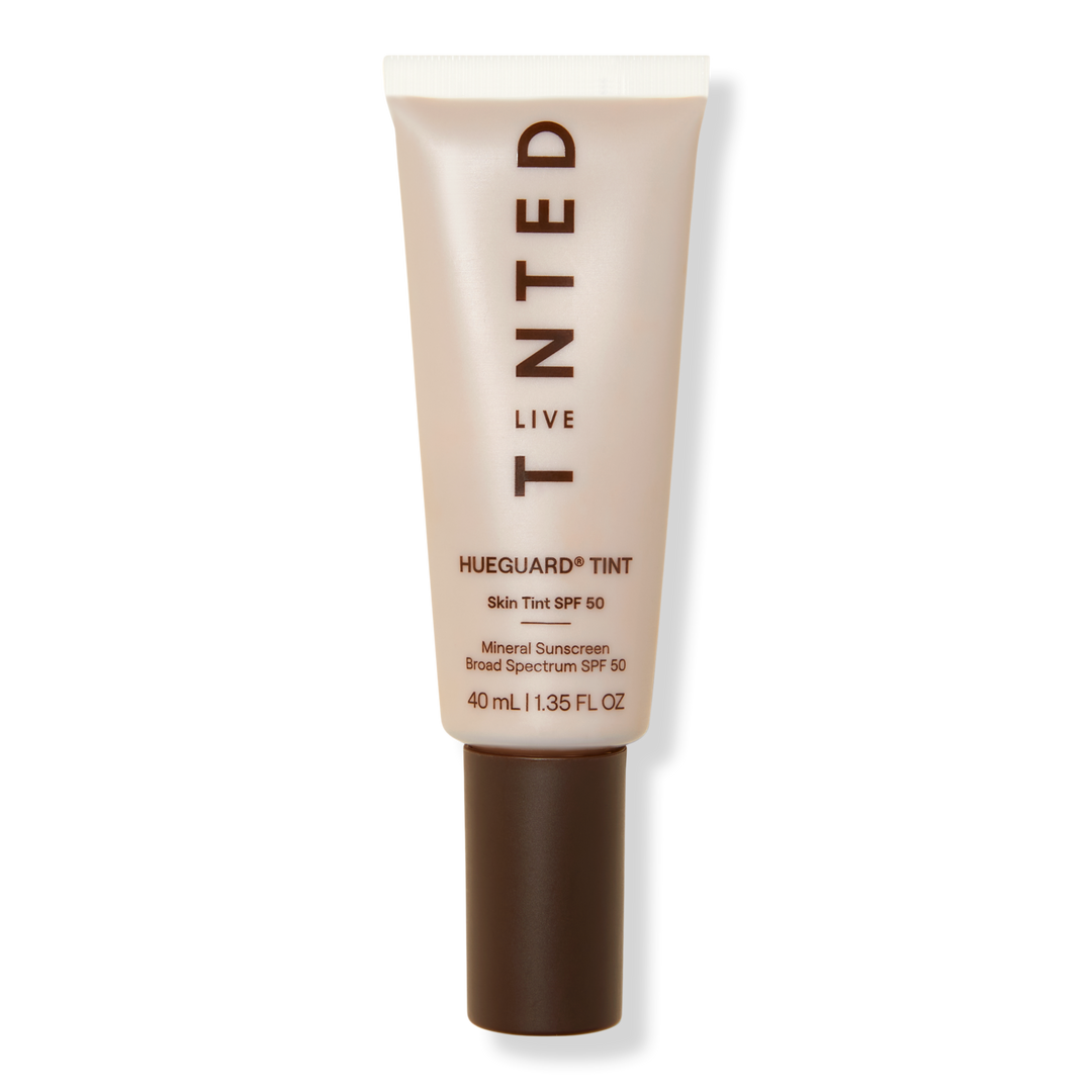 A weightless, light-medium buildable coverage skin tint with no-white-cast mineral SPF 50 that protects skin with all-day hydration and a radiant finish, Live Tinted's Hueguard Skin Tint SPF 50 Mineral Sunscreen Broad Spectrum has skincare actives to hydrate, protect, and smooth skin in one step.