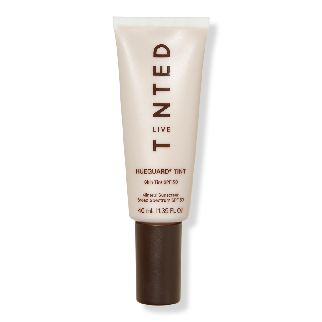 A weightless, light-medium buildable coverage skin tint with no-white-cast mineral SPF 50 that protects skin with all-day hydration and a radiant finish, Live Tinted's Hueguard Skin Tint SPF 50 Mineral Sunscreen Broad Spectrum has skincare actives to hydrate, protect, and smooth skin in one step.