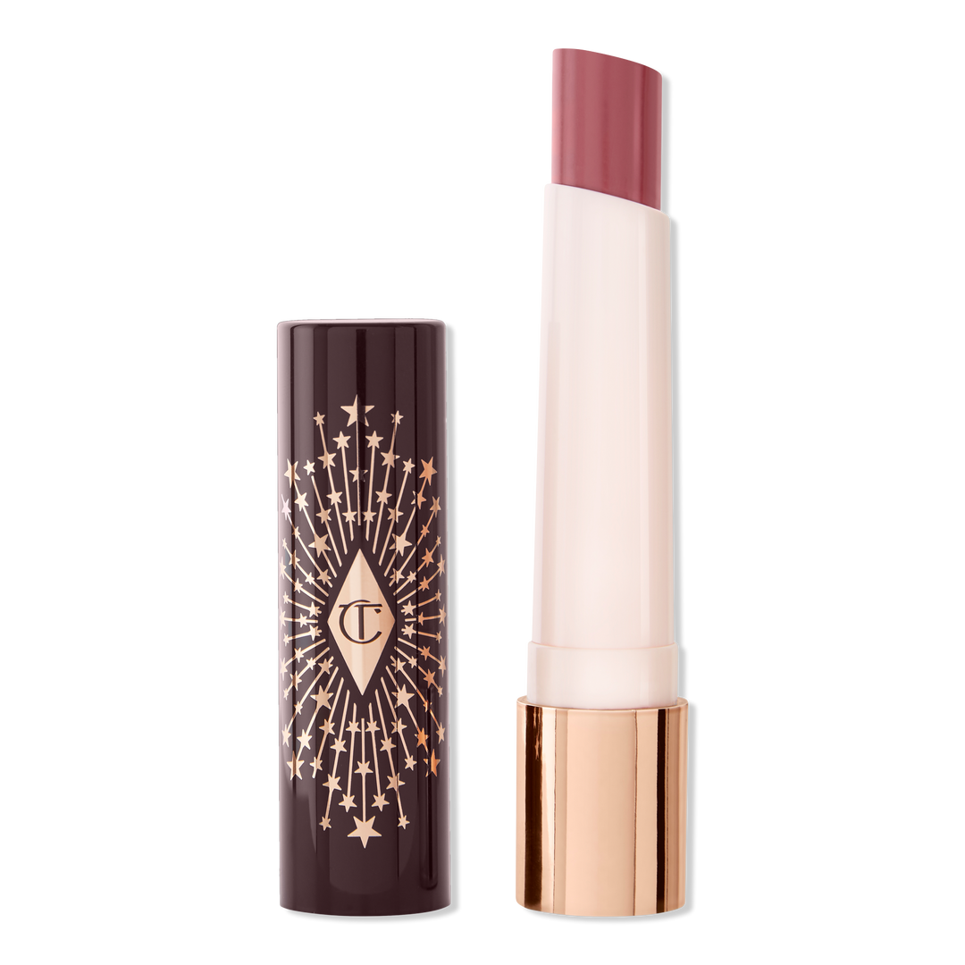 Charlotte Tilbury's Hyaluronic Happikiss Lipstick Balm with a hyaluronic-acid-infused formula that provides the hydrating power of a balm with the color payoff of a lipstick for a pigmented, dewy lip look.