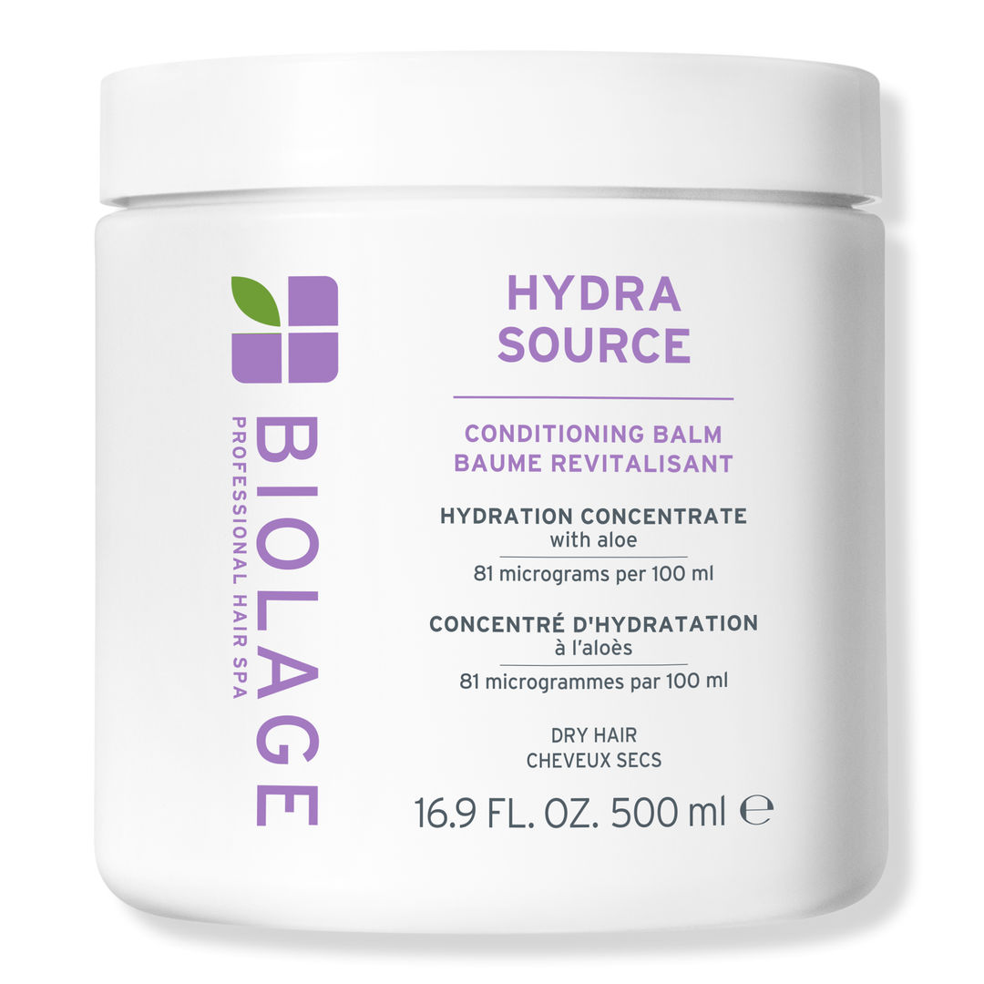 Experience weightless hydration with Biolage Hydra Source Conditioning Balm for dry hair! This silicone-free jelly-like balm, infused with micro-filtered aloe vera, conditions and detangles hair, adding softness and a silky-smooth touch.