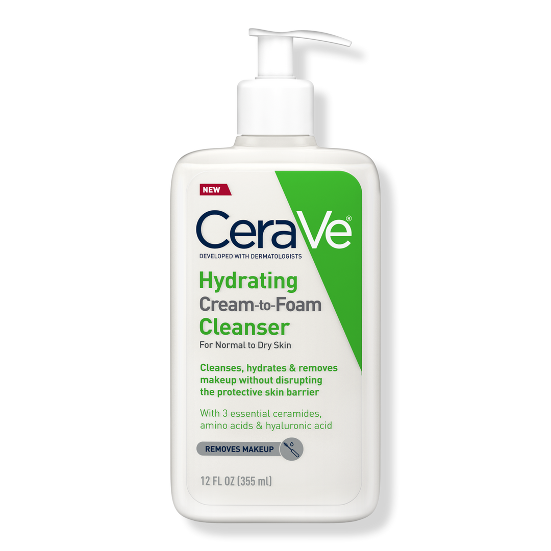 CeraVe Hydrating Cream-to-Foam Cleanser with hyaluronic acid for balanced to dry skin removes oil and makeup while reinforcing the skin barrier with ceramides.