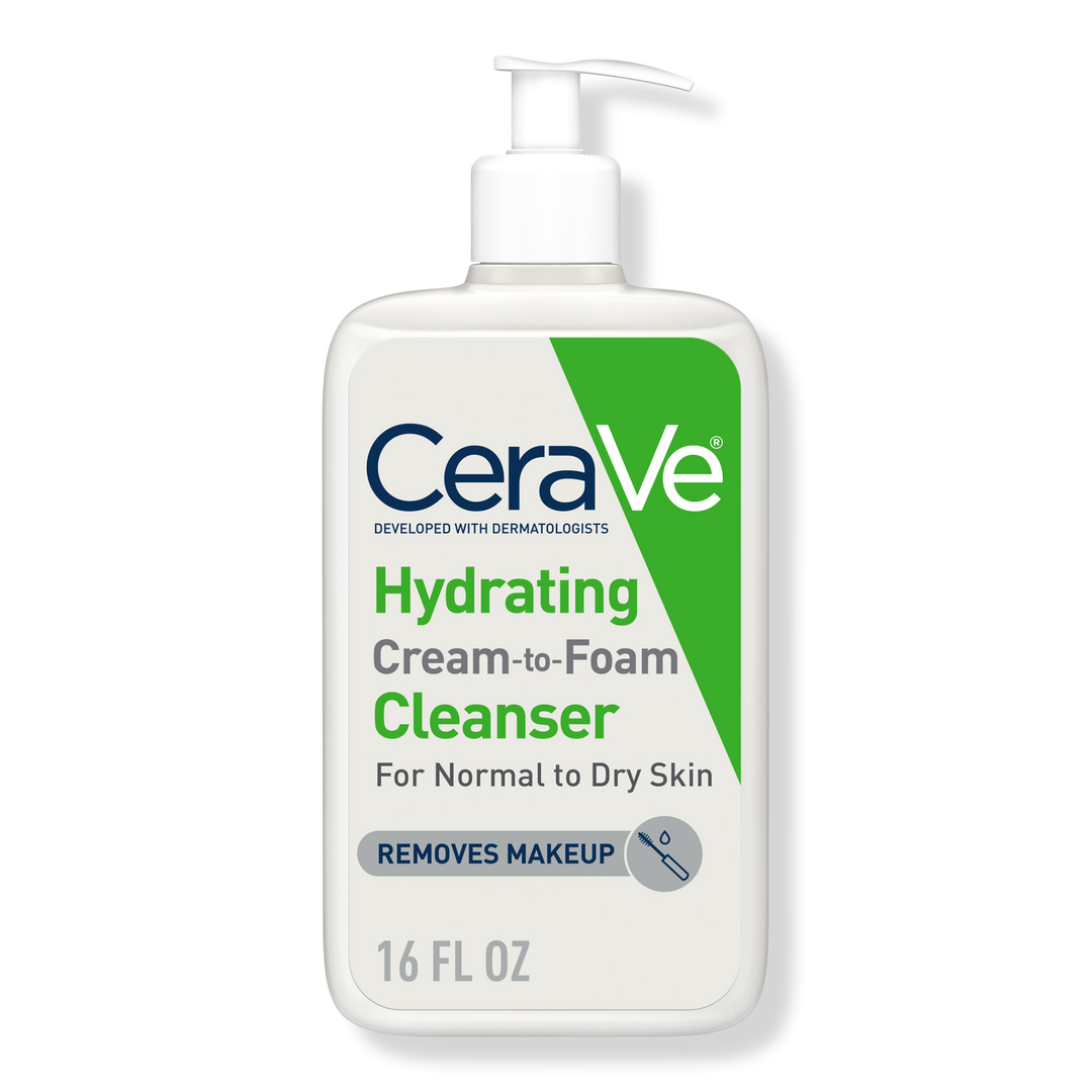 CeraVe Hydrating Cream-to-Foam Cleanser with hyaluronic acid for balanced to dry skin removes oil and makeup while reinforcing the skin barrier with ceramides.