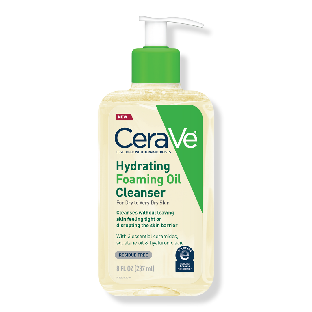 CeraVe Hydrating Foaming Oil Cleanser is a water-based face wash for dry skin with hyaluronic acid, ceramides, squalane and triglycerides, that cleanses without stripping moisture.