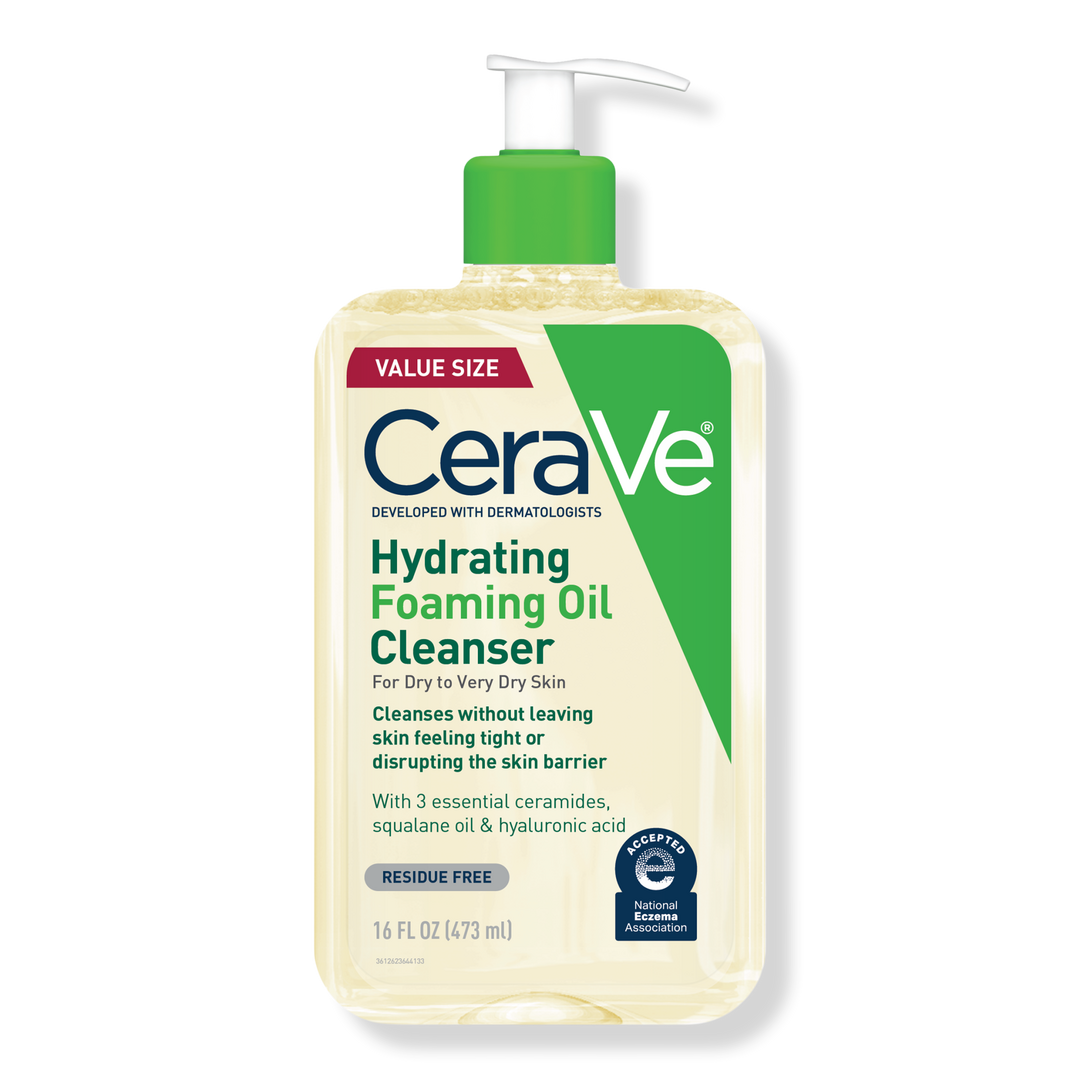 CeraVe Hydrating Foaming Oil Cleanser is a water-based face wash for dry skin with hyaluronic acid, ceramides, squalane and triglycerides, that cleanses without stripping moisture.