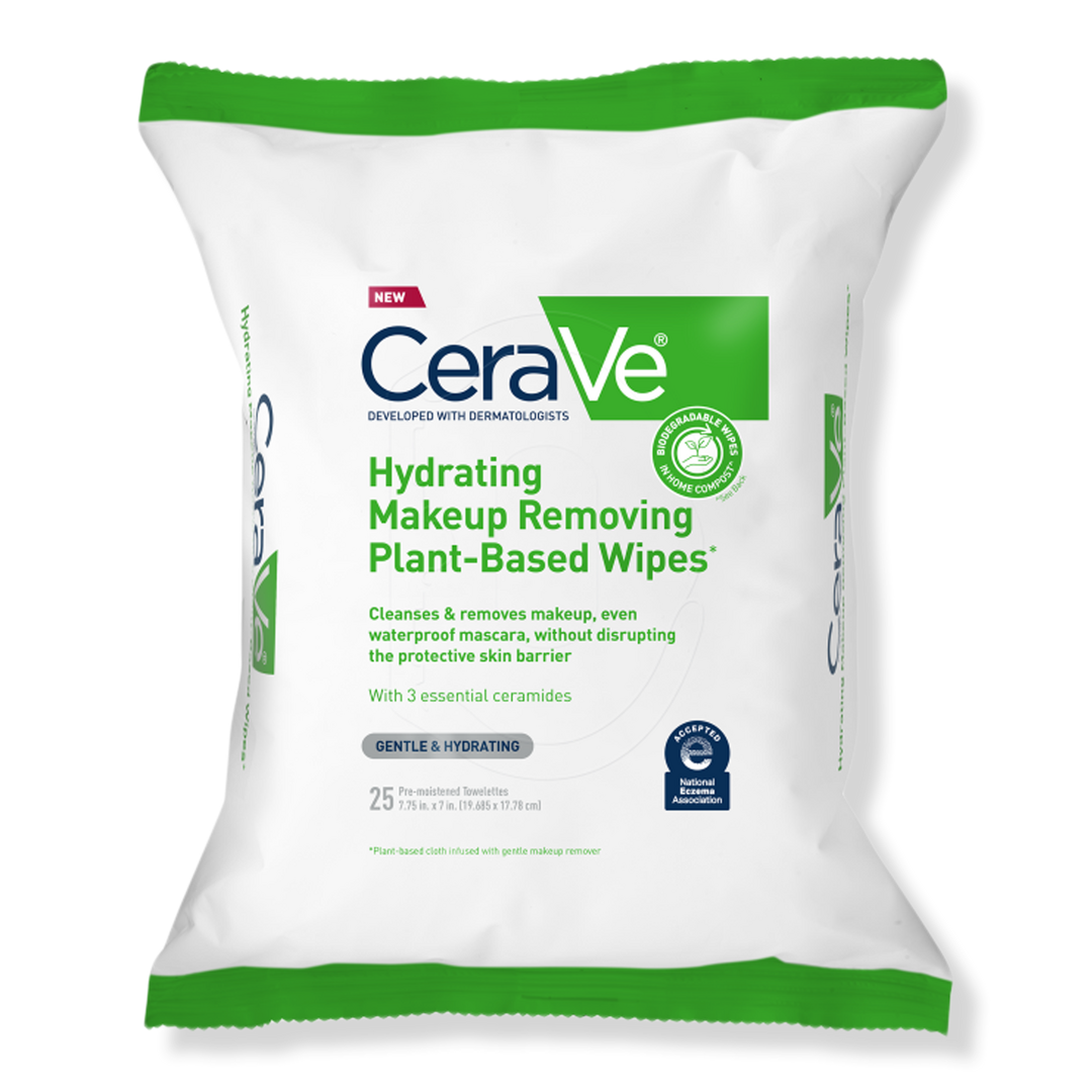 CeraVe Hydrating Makeup Removing Plant-Based Wipes cleanses and removes makeup, even waterproof makeup, without disrupting the protective skin barrier. The 100% plant-based wipes are ultra-gentle on skin, eye area, lashes and are biodegradable in home compost.