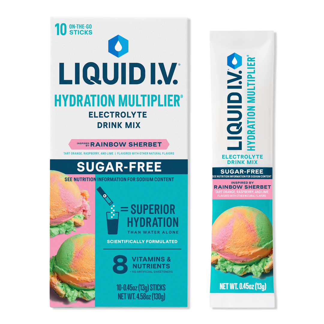 LIQUID I.V. Hydration Multiplier Electrolyte Drink Mix Sugar Free Rainbow Sherbet swirls together notes of honeyed raspberry, orange peel, and zesty lime flavors.