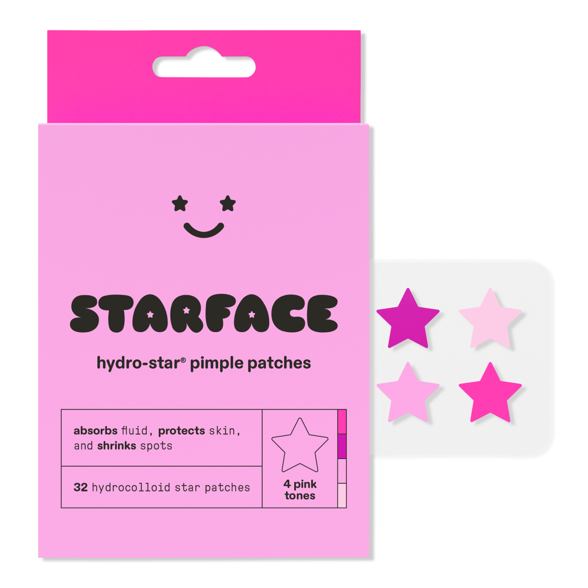 Starface Hydro-Star Pimple Patches help absorb fluid, reduce redness, and shrink spots in 6 hours* with a 100% hydrocolloid formula. Includes 32 patches that help flatten surface-level pimples and juicy whiteheads while looking cute.