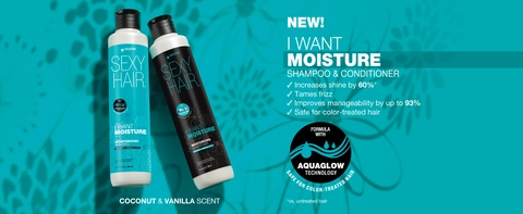 SexyHair I WANT MOISTURE Moisturizing Shampoo & Conditioner. This formula with AquaGlow Technology is color-safe, tames frizz, and boosts shine by 60%*, giving you soft, glowy locks that demand attention. Flaunt your glamourous hair after just one use.